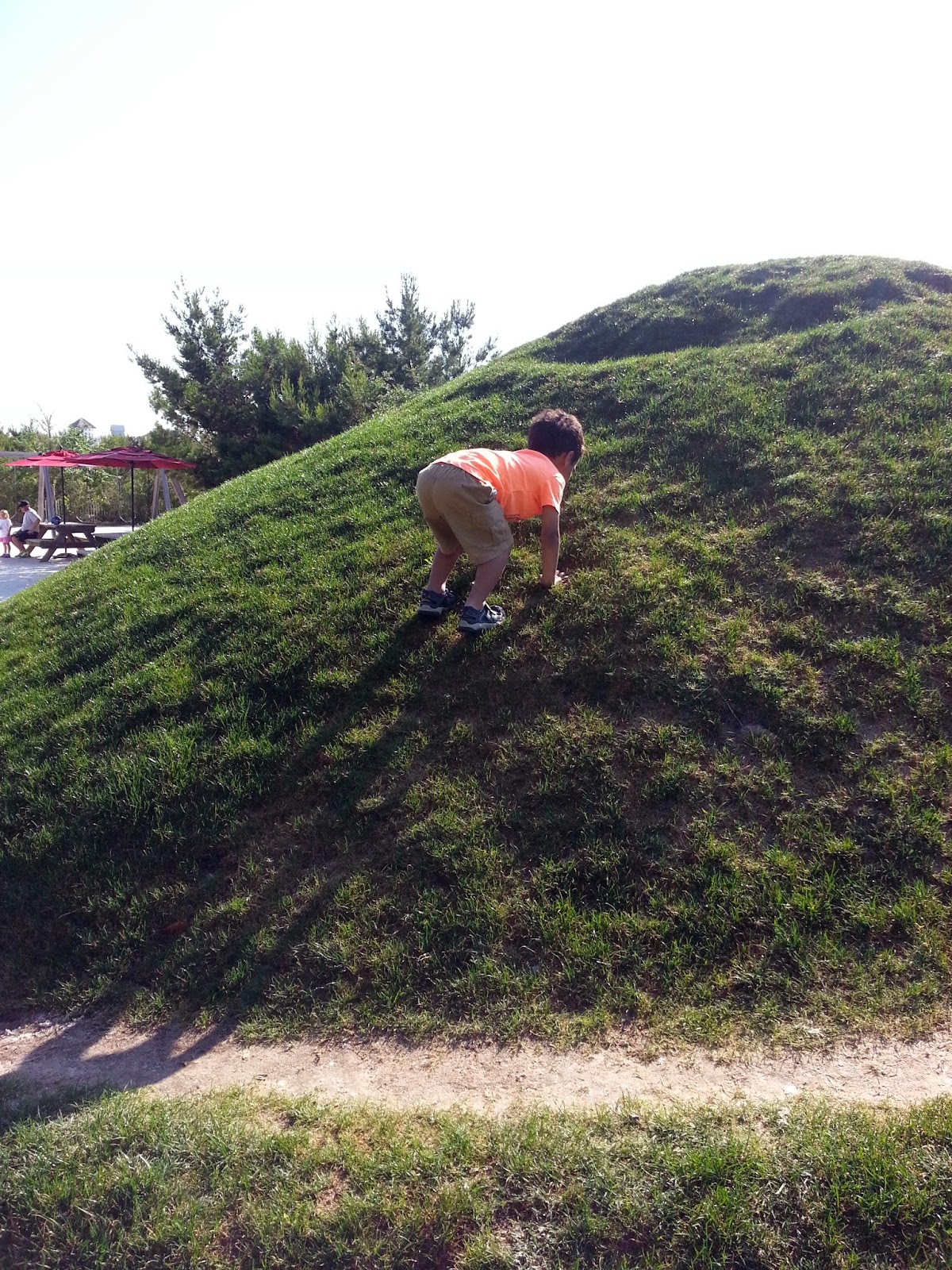 After donuts, we kept walking until we got to the Alys Beach playground. This was a fun little park with some nice slides and an old-fashioned see-saw, but the main attraction was a giant and very steep hill. I am not sure what it's original purpose was (it's possible it was always part of the playground, but there is a broken sprinkler head at the top so I am not sure), but it was really great for Joshua and the other kids there. It has a path to get to the top, but Joshua refused to use it and really enjoyed climbing up and down the hill.