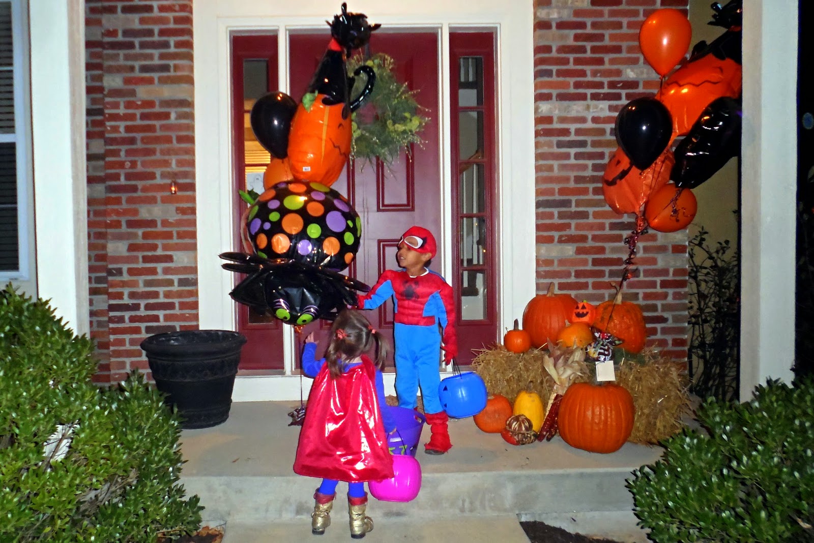 But soon they had to go and the moment Joshua had been dreaming about all month and certainly all day arrived. It was pretty much everything he hoped. This year he has been really excited to learn that pretend scary things are a part of Halloween and it's funny to pretend to be scared. So he has enjoyed screaming around ghosts and jack-o-lanterns and other things like that. Imagine his delight when a flower delivery guy left this huge balloon bouquet on someone's porch who wasn't home. He thought the giant spider was great. I wasn't as sure. We live in a pretty friendly neighborhood and I haven't heard of anything like egging, pumpkin smashing, TPing, or other mischief you hear about on TV happening here or really any place I have ever lived, but I still wouldn't suggest leaving something like that unattended on Halloween.